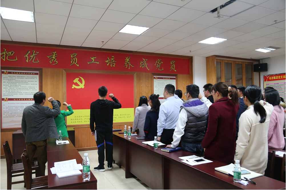 会议最后,全体老党员带领四名新加入支部的党员进行入党宣誓,“我志愿加入中国共产党,拥护党的纲领,遵守党的章程......”,全体党员面对党旗,许下铮铮誓言,这不仅是一份庄严的承诺,更是一份担当、一份信念、一份责任。此次大会井然有序进行,既是一次纳新会议,又是一次新老党员接受再教育的会议,集团党支部增添了新生力量,加强了支部凝聚力,希望新加入支部的党员同志始终不忘使命,用实际行动践行诺言,为党旗增辉,为裕达添彩。